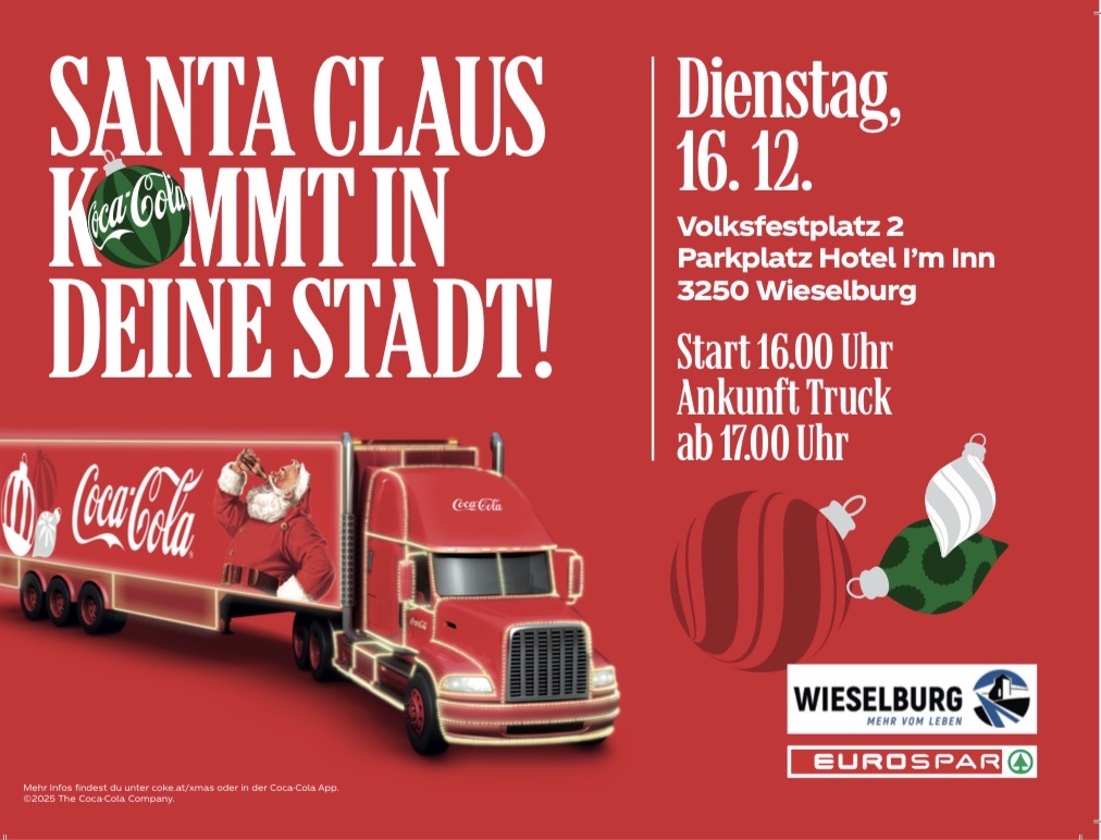 Der Cola – Truck kommt nach WieselburgDezember 1, 2025Dezember 1, 2025In Events, NeuigkeitenSpar Moser bringt den Cola – Weihnachtstruck nach Wieselburg am 16. Dezember ab 16 Uhr Messeplatz 2 – Parkplatz Hotel I´m Inn
