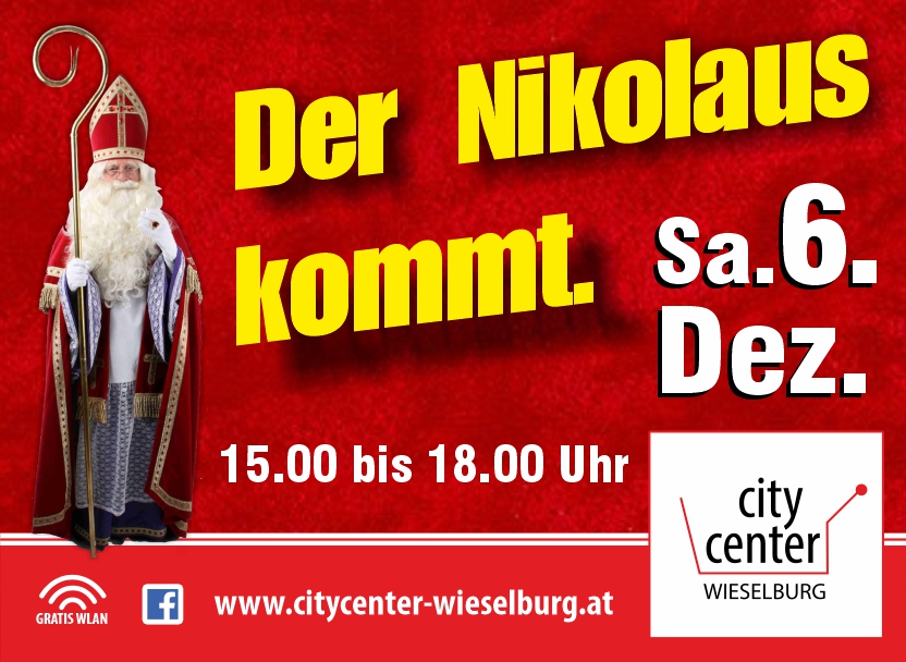 Der Nikolaus kommt!Dezember 4, 2025Dezember 5, 2025In Aktionen, Events, NeuigkeitenAm Samstag 6. November von 15 – 18 Uhr kommt der Nikolaus ins City Center Wieselburg