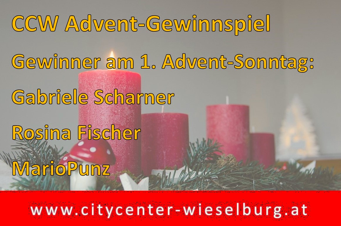 Gewinner erster AdventsonntagDezember 1, 2025Dezember 1, 2025In Aktionen, Events, NeuigkeitenGewinner des CCW Weihnachtsgewinnspiels Am ersten Adventsonntag haben gewonnen: Gabriele Scharner Rosina Fischer Mario Punz