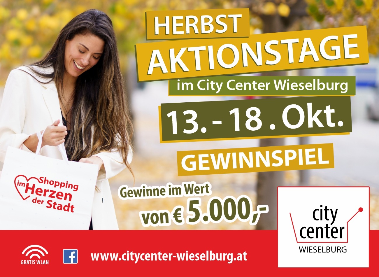 Herbst – AktionstageOktober 10, 2025Oktober 10, 2025In Aktionen, Events, Gewinnspiel, UnterhaltungDie Herbst-Aktions-Tage im ‚City Center Wieselburg Aktionen & Gewinnspiel Super Aktionen in allen Shops CCW Herbst-Gewinnspiel mit Preisen im Gesamtwert von € 5.000,- Glücksrad am Samstag 18. Oktober Brotverkostung am Samstag 18. Oktober